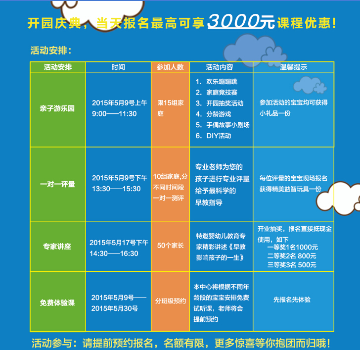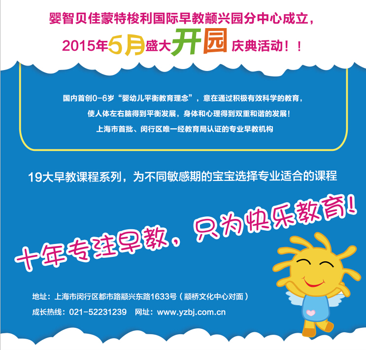 上海嬰智貝佳早教中心顓興園是上海市小拇指教育集團在閔行區(qū)全新打造的又一嬰幼兒成長的樂園,2015年5月盛大開園~!為慶祝這一喜慶的5月,特開展了一系列的慶?;顒优?。爸爸媽媽快來參加吧。