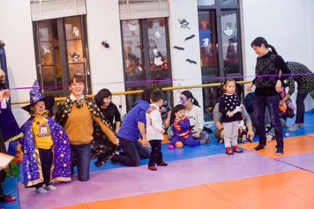 接下來的游戲叫做“盤絲洞搭蘋果”。家長和寶寶們也是需要互相協(xié)作來完成,大家都可是拼了呢!
