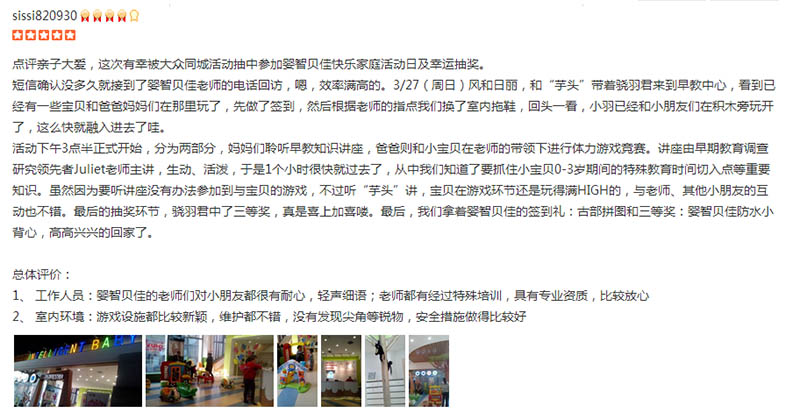 嬰智貝佳早教應(yīng)大眾點(diǎn)評(píng)網(wǎng)官方社區(qū)頻道之約,要為點(diǎn)評(píng)網(wǎng)的資深會(huì)員謀福利----提供一場(chǎng)歡樂的親子早教社區(qū)活動(dòng)。經(jīng)過1個(gè)月的籌劃和準(zhǔn)備,3月27日在嬰智貝佳七寶?華商時(shí)代園運(yùn)動(dòng)教室,為大眾點(diǎn)評(píng)網(wǎng)幸運(yùn)的從255組家庭中幸運(yùn)中獎(jiǎng)的20組18-36個(gè)月寶貝家庭舉辦了一場(chǎng)活動(dòng)與講座同步、快樂與收益并得的線下早教活動(dòng),當(dāng)然還有豐富的獎(jiǎng)品等著幸運(yùn)的寶貝們。讓我們來看看小編的報(bào)道吧。