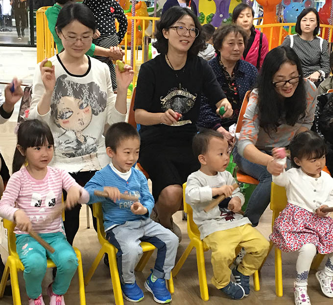 此時活動現(xiàn)場已經(jīng)達到了一個高潮,樂器演奏時間到了,小小音樂家們分成兩組分別用沙錘和節(jié)奏棒為大家奏樂,聽!我們的二重奏演奏是不是很棒啊!