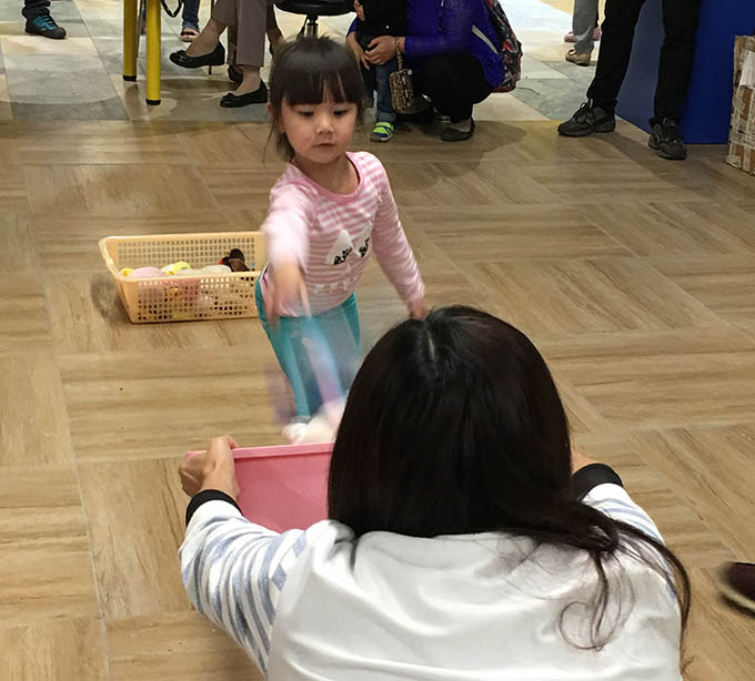 演奏時間結束了,到了我們精彩的競技游戲環(huán)節(jié)了,猜猜我們今天會玩什么好玩的游戲呢?第一個游戲是投擲小玩偶,看我們寶寶和媽媽分工合作,一個拋一個接,配合默契哦!