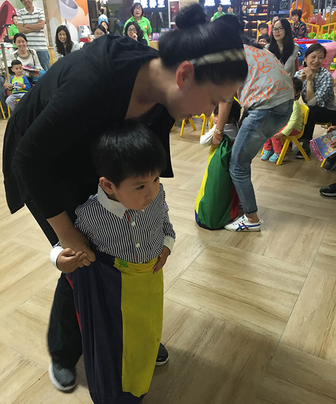 第二個游戲是袋鼠跳,我們家長帶著寶寶像袋鼠一樣跳到對面的終點,粑粑麻麻你追我趕競爭很激烈啊!