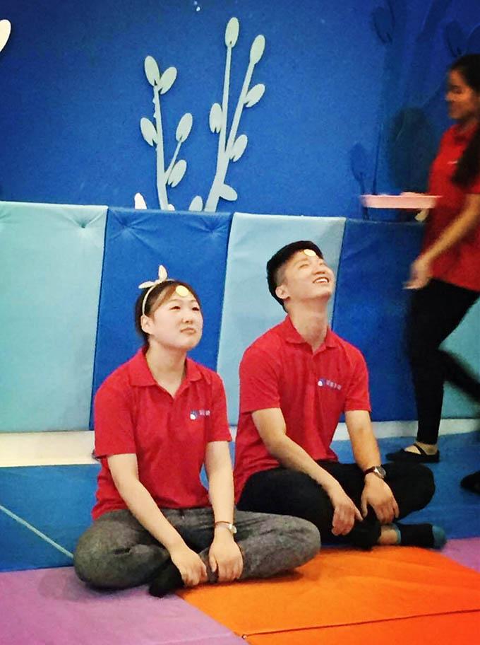看老師和家長們PK玩起了擠眉弄眼的游戲,把餅干放在額頭上用舌頭勾著吃,是不是很有意思啊
