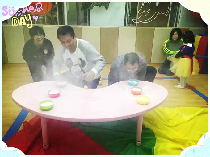 寶寶們將呼啦圈套到媽媽的身上,隨后爸爸需要將乒乓球從裝滿面粉的第一個碗里,吹到第三個碗內(nèi)。