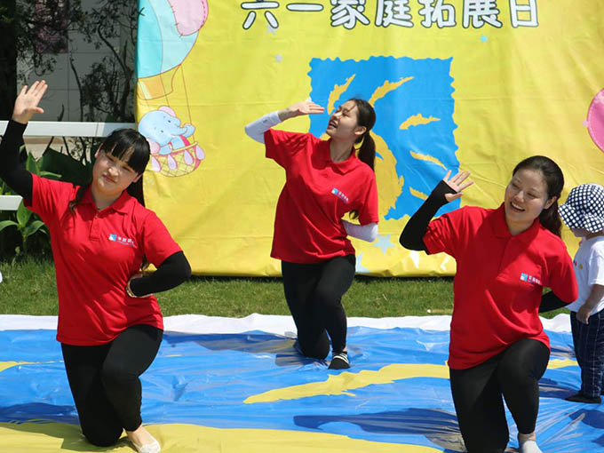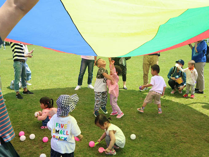 “小球,小球,滾啊滾;小球,小球,滾啊滾?!崩蠋熀桶职謰寢寕?yōu)閷殞殦纹鹨话焉拾邤痰牟屎鐐?,在美麗的彩虹傘下,寶貝們快?lè)的玩耍著,一個(gè)一個(gè)的海洋球在地上,寶寶的手上跳躍著。