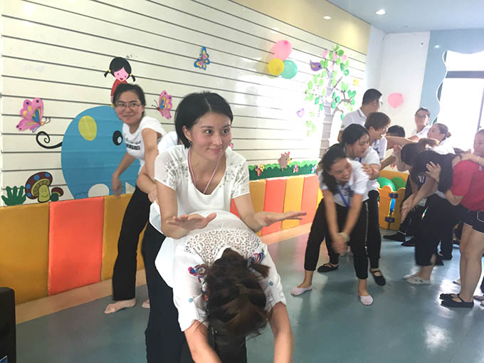 下面這兩張照片怎么回事兒?你們看出來了嗎?原來是要通過團(tuán)隊(duì)的智慧去表演一只大象。還真是有模有樣,雙手向下伸出作為大象的鼻子,最后一位老師雙腿上抬作為大象的尾巴,只不過小編不理解的是大象有那么多的腿嗎?哈哈(捂嘴笑)