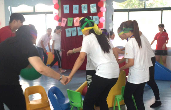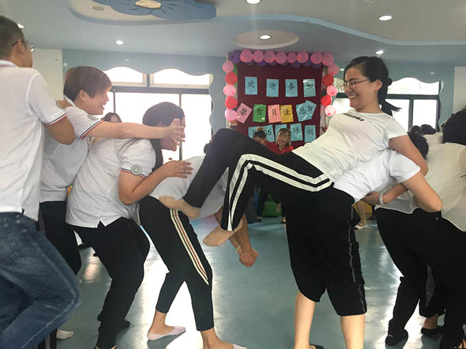 所有隊(duì)員老師排成一排,第一位老師看到答案之后,通過自己的肢體向第二位老師進(jìn)行表演,當(dāng)然在表演的過程中,其他老師都是背向他們。以此類推,站在最后的一位老師要說出答案。哈哈,明明是謎底是小Baby,最后有可能會被說成是可愛的小豬,因?yàn)槌顺跃褪撬@腦回路也沒誰了!太多好玩兒的細(xì)節(jié)小編也就不一一分享啦,下次有機(jī)會可以一起來參加哦!