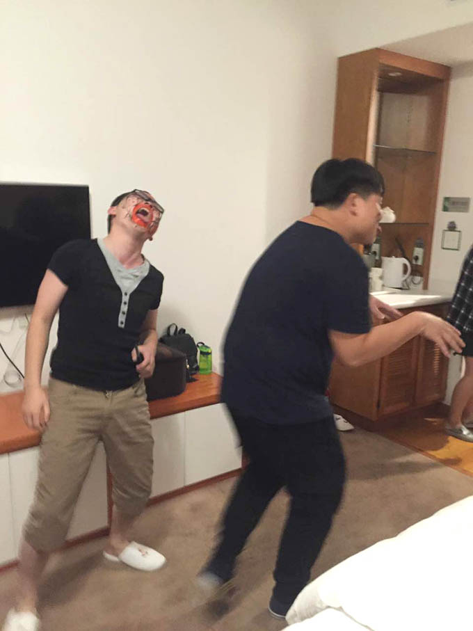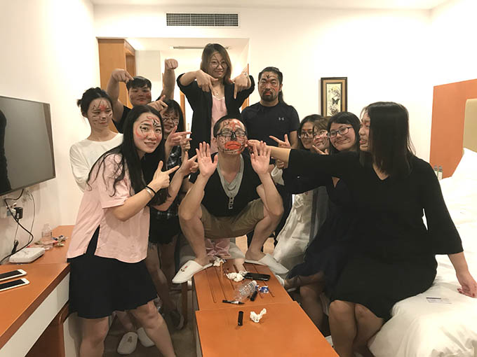哈哈,肚子都笑出了皺紋。玩的是一個(gè)猜數(shù)字的游戲,誰猜中就要在誰的臉上畫上一筆,且一筆不能斷。我們李老師臉上那么“不堪入目”也才只畫了三筆。好了,笑的快說不出話了,看視頻吧!