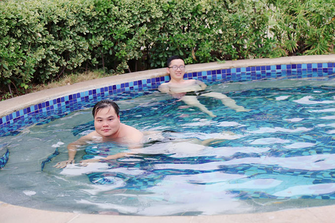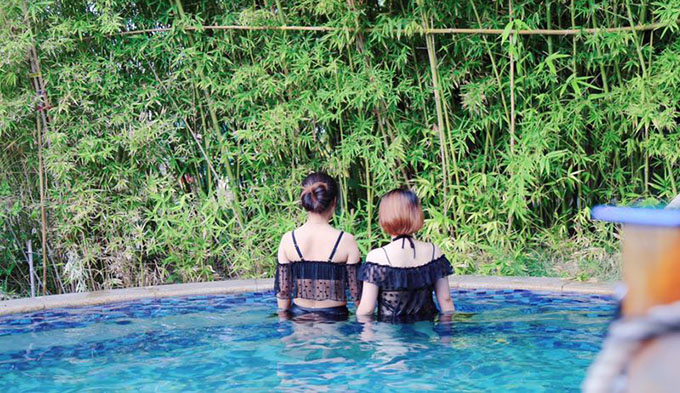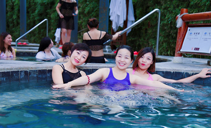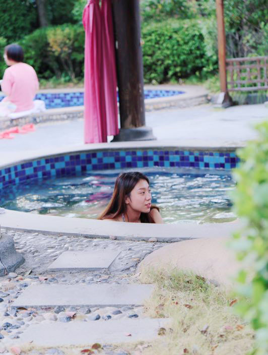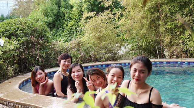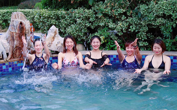 水霧氤氳,泉涌自然。老師們?nèi)齼蓛摄逶≡诟鞣N花卉靈草溫泉池中,在天地眷顧的地方,放逐身心,悄悄秀出青春。