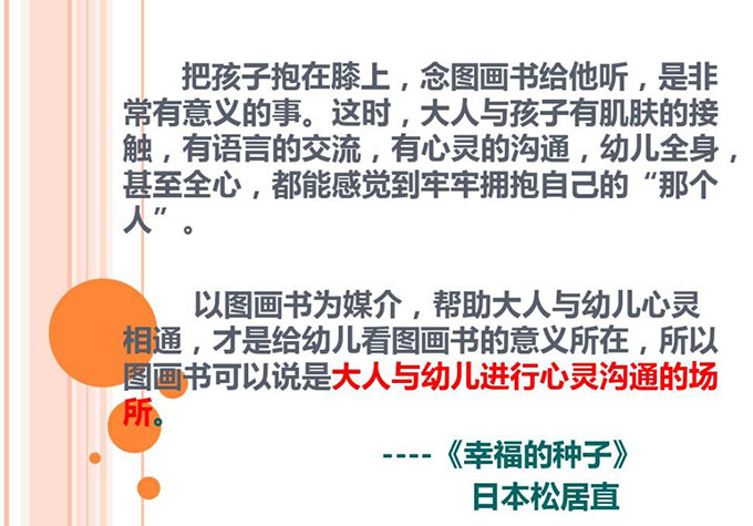 把孩子抱在膝上,年圖書給他聽,是非常有意義的事。這時(shí),大人與孩子有肌膚的接觸,有語言的交流,有心靈的溝通,幼兒全身甚至全新,都能感覺到牢牢擁抱自己的那個(gè)人