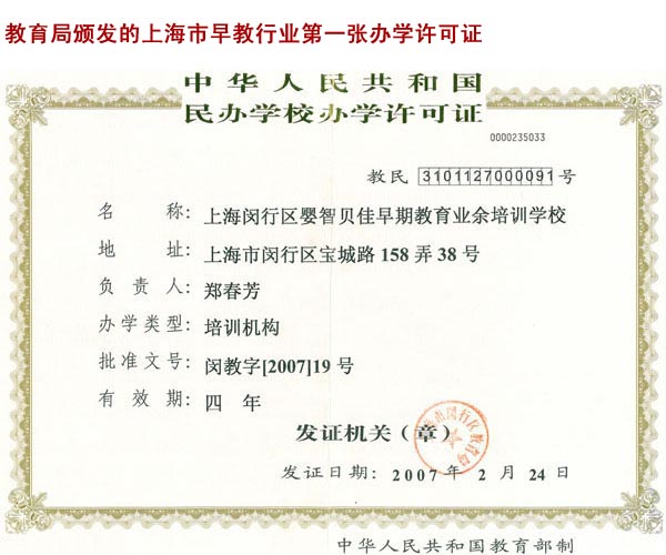 嬰智貝佳作為正規(guī)的早教中心,于2007年2月取得了上海市教育局頒發(fā)的上海市第一張?jiān)缙诮逃k學(xué)許可證,2018年獲得騰訊網(wǎng)“2018年度家長信賴兒童教育品牌”,嬰智貝佳的老師全都具備教師資格及育嬰師資格證書,教育部門有關(guān)專家定期到學(xué)校進(jìn)行專業(yè)指導(dǎo),教育質(zhì)量得到充分的保證,連續(xù)多年被評(píng)為優(yōu)秀民辦早教機(jī)構(gòu),所以嬰智貝佳在此特別提醒各位家長:在把您的孩子送去參加早教或有意加盟某家連鎖早教時(shí),一定要其出示教育部門頒發(fā)的辦學(xué)許可證,以免您的利益受到損害。