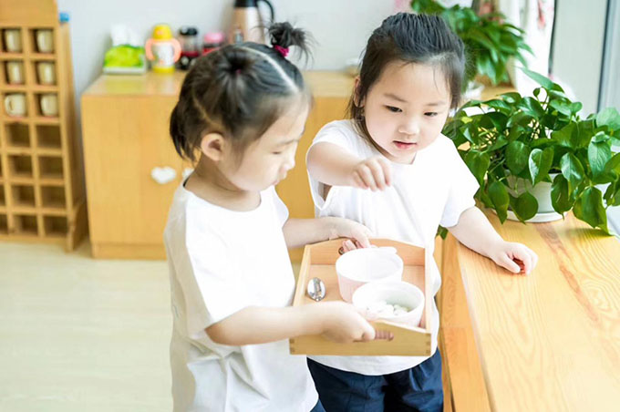 蒙氏教育的教學(xué)環(huán)境是一大特色,所有的家具和教具都按照兒童尺寸設(shè)計制作,方便孩子們隨時拿取,用完后可以及時放回原地。