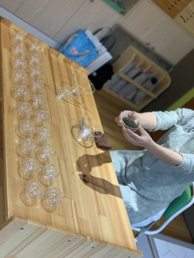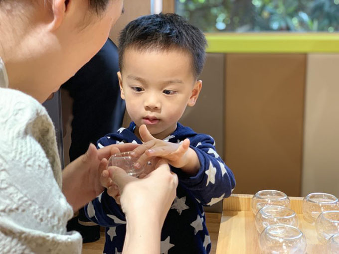 路昊文媽媽用心地傳授關(guān)于泡茶、品茶、請茶、奉茶的知識和禮儀,寶寶們專心地、如饑似渴地學(xué)習(xí)、吸收這些知識。