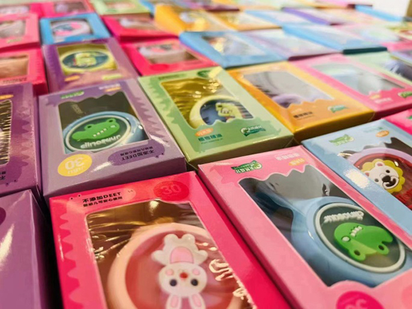 園所給小朋友送上兒童節(jié)禮物:防蚊手環(huán)。