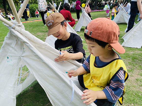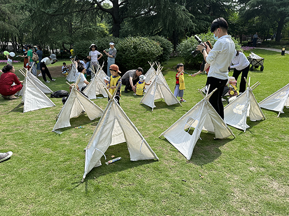 本次的壓軸大戲:DIY的小帳篷 搭好了,就等寶貝們開展想象力動手了。